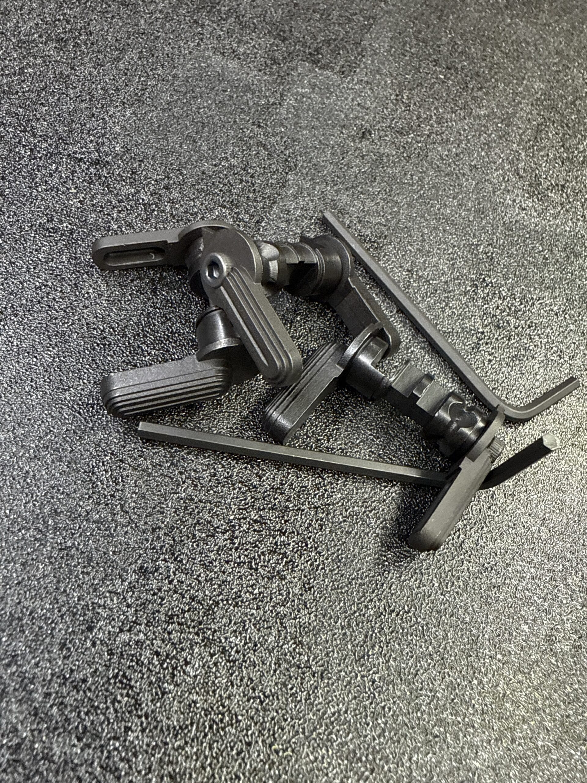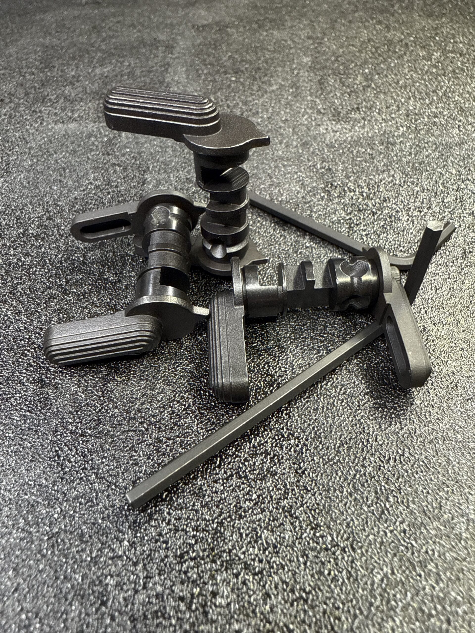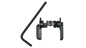 Normalized Ambidextrous Configurable Handle (SN-ACH). Built around a heat treated ordnance grade steel central selector hub, two black nitride 17-4 selector paddles can be configured to the users needs whether the user is right or left handed. The hub incorporates a optional screw for trigger match style overtravel adjustment of standard AR-15 or M4/M-16 triggers, enhancing the human interfaced accuracy of the host firearm (enhanced shoot-ability). Overtravel adjustment reduces the time that the applied trigger pull weight is removed from the rifle during firing after the trigger break and prior to reaching the limit of travel. Reducing this time of lost equilibrium, reduces the wobble zone created by the removal of weight at the moment of break.